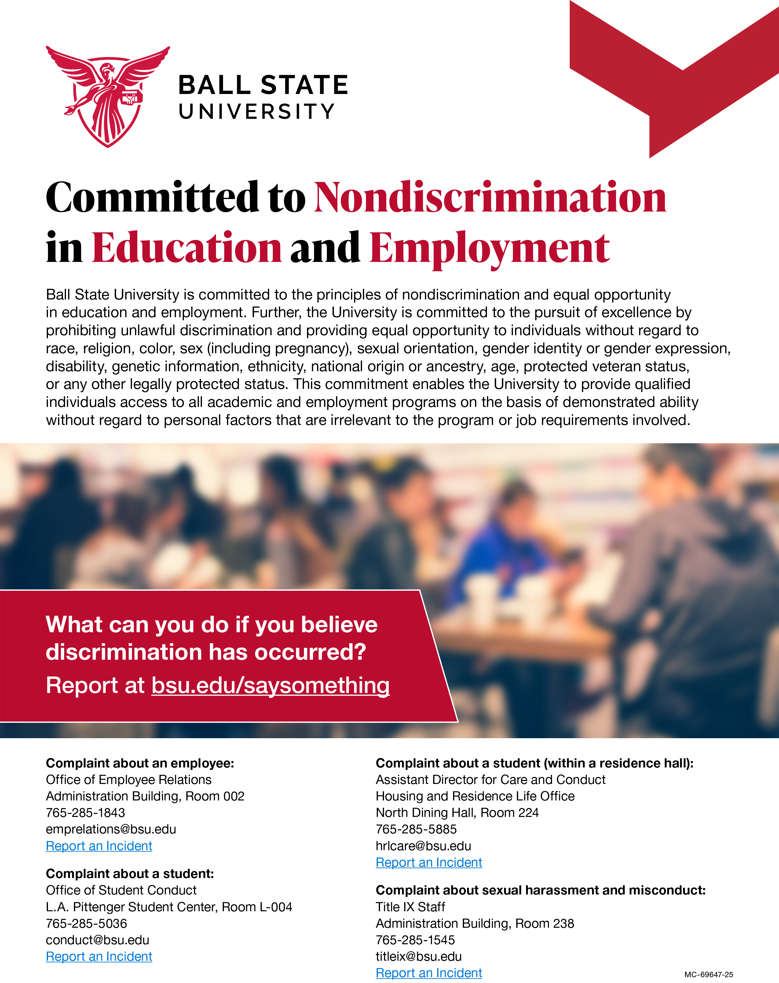 Ball State University is committed to the principles of nondiscrimination and equal opportunity in education and employment. Further, the University is committed to the pursuit of excellence by prohibiting unlawful discrimination and providing equal opportunity to individuals without regard to race, religion, color, sex (including pregnancy), sexual orientation, gender identity or gender expression, disability, genetic information, ethnicity, national origin or ancestry, age, protected veteran status, or any other legally protected status.