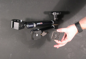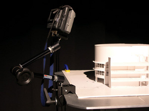 Positioning the camera becomes particularly difficult when using the platform heliodon since the table turns and tilts to adjust the model relative to the sun's position. To assist with this, CERES has provided an adjustable tripod clamp that can be attached to the camera and to the table surface. This allows the camera to move in concert with the table and model. This keeps the camera's framed shot of the model consistent regardless of the table's position. From the camera's point of view, this relationship also helps maintain the perception of the sun moving through the sky rather than the table tilting and swiveling.