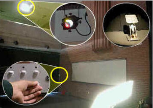 The room may be darkened by switching off the lights at the switch plate at the east end of the south brick wall.