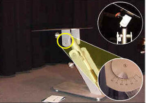 Using the supplied clamps, securely clamp the model base to the table in at least two separate locations. Optimally, the clamps should be placed on or toward the north side of the model to prevent the clamps from casting shadows onto or into the model. When the model is believed to be secure, slowly and carefully swivel the time of day adjustment to confirm that the model will remain on the table and to ensure that the clamps do not interfere with the free motion of the table mechanisms.
