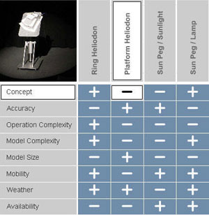 Above is a summary matrix of the pros and cons of Ring Heliodon methodology. The best method varies with each user and each situation. | |