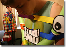 Peter Corey in costume as a tap-dancing strand of DNA & Joel Miller as entrepreneur Mayhew Laslow, characters in one of the play's films.