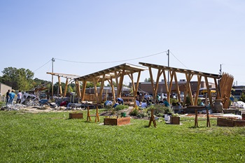 Students and members of the community explore the outdoor playscape and learning center designed by associate architecture professor Pam Harwood and her students.