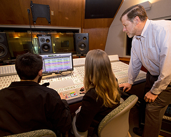 Music media production majors Alex Rodriguez and Allison Swingley and professor Robert Willey use a mixing board inside the Music Instruction Building. Producers of “The Song” sought Ball State based in large part on its top-notch recording studios.