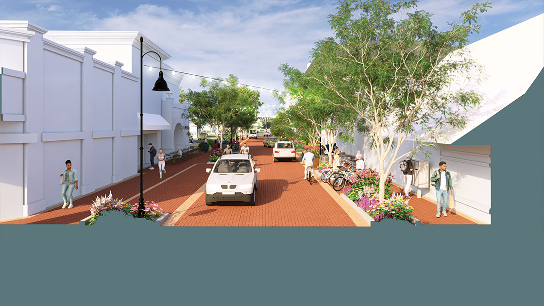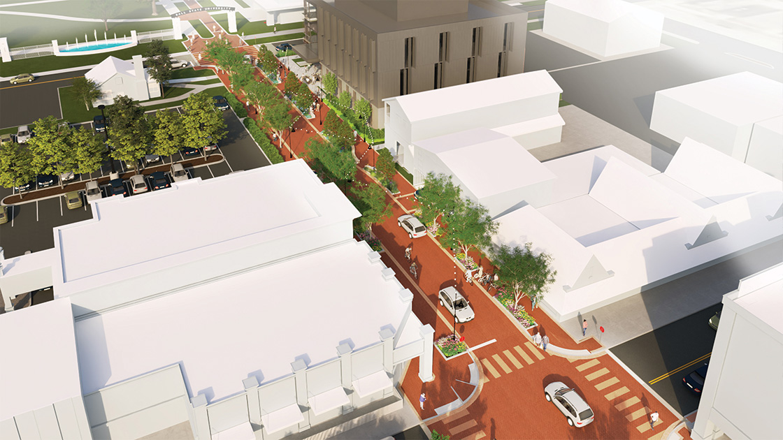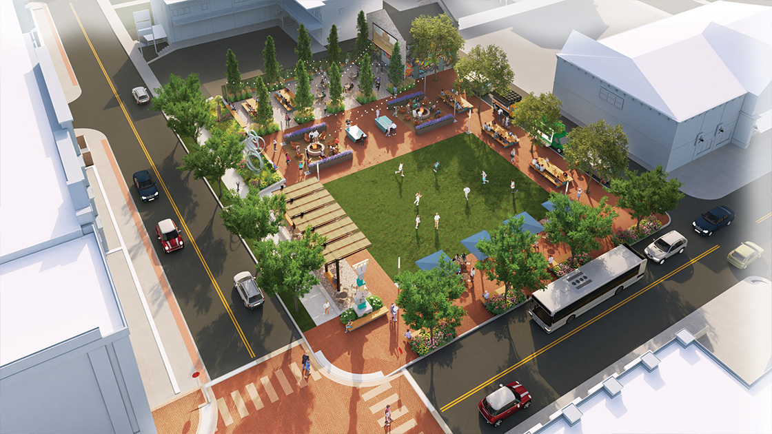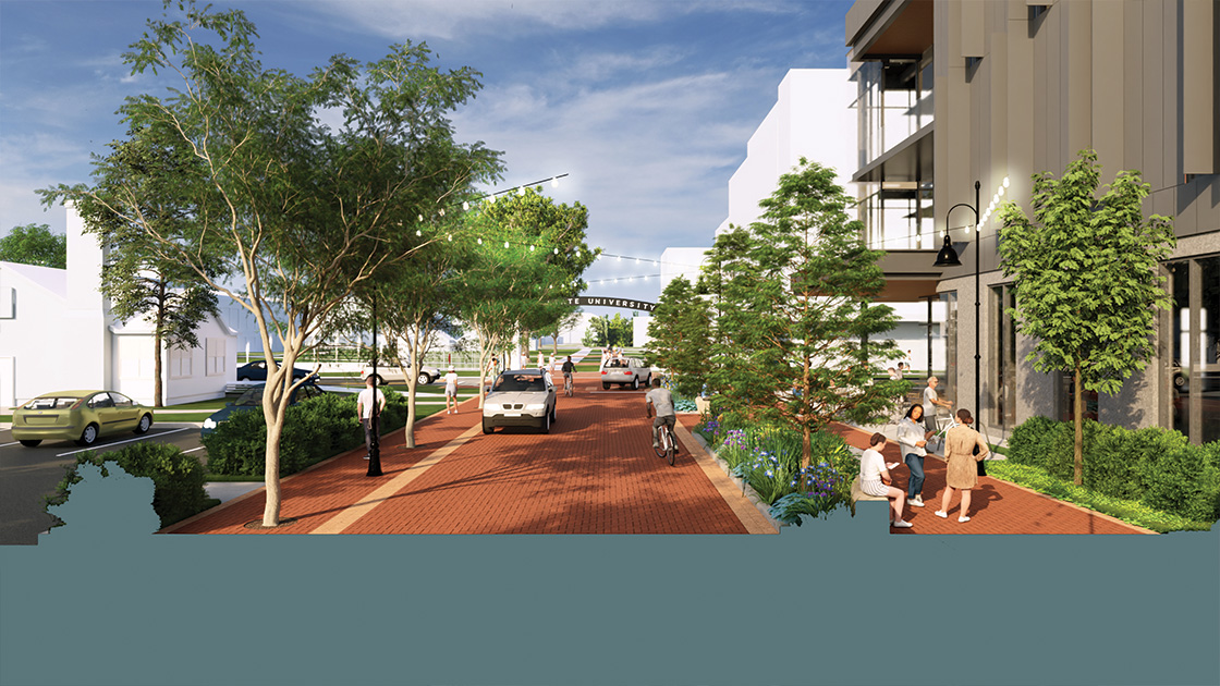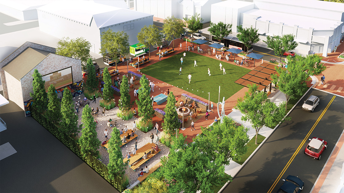 The plan for Village Green incorporates design insights gathered through a Fall 2025 Estopinal College of Architecture and Planning (ECAP) student design competition, which drew 54 submissions and nearly 2,000 public votes. The plan includes green space, a signature gateway element featuring public art, shaded seating, game-ready hardscape, food-truck staging space, and enhanced lighting.