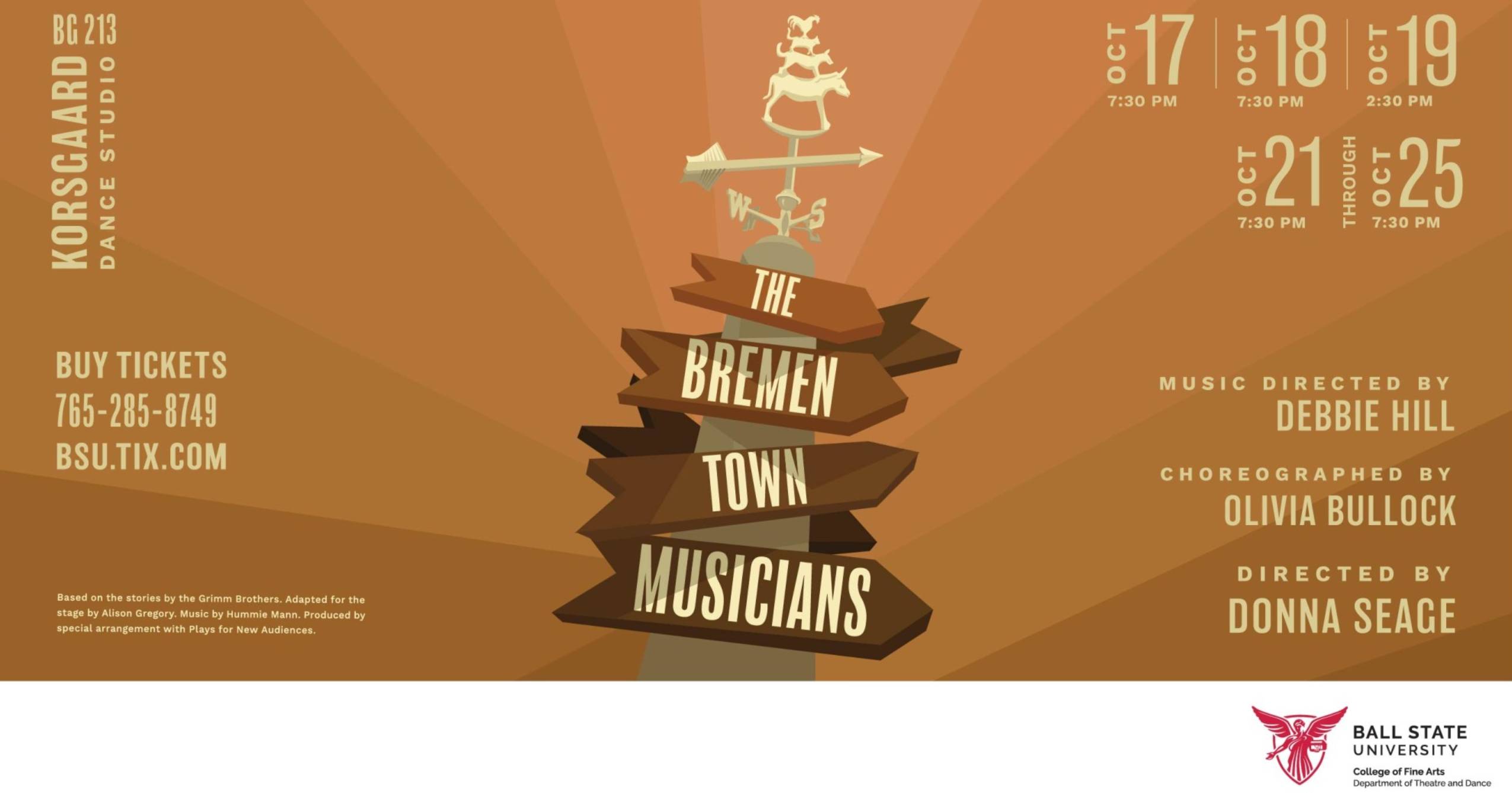 Ball State University’s Department of Theatre and Dance presents "The Brementown Musicians"—based on stories by the Grimm Brothers and adapted for the stage by Alison Gregory—Oct. 17-19 and 21-25 at Korsgaard Dance Studio in Ball Gymnasium.
