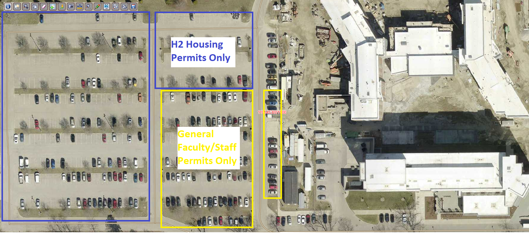 Zoned areas, parking lot numbers, and locations for paid parking.
