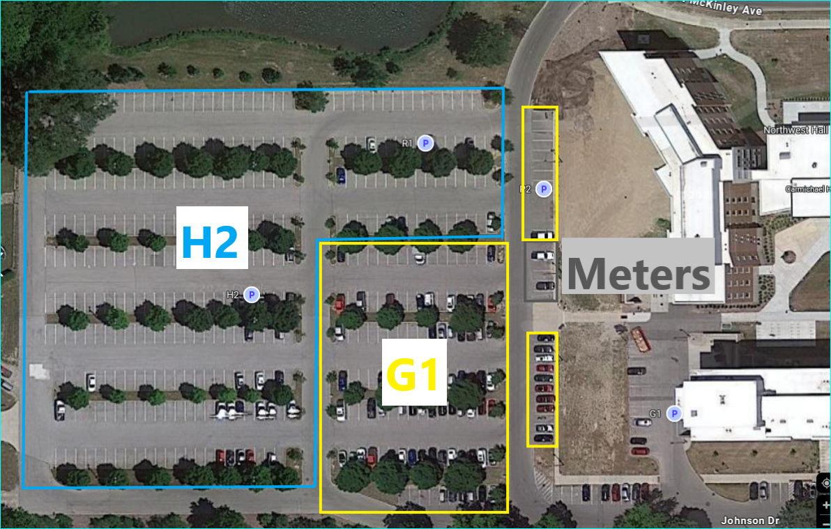 McKinley Avenue Parking Garage (R7) – Metered parking is located on the bottom floor of R7 with a pay station located at each pedestrian exit.