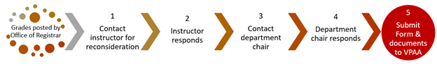 - Student starts the process (Step 1) by emailing the instructor to request a grade reconsideration including reasons to support the reconsideration request.