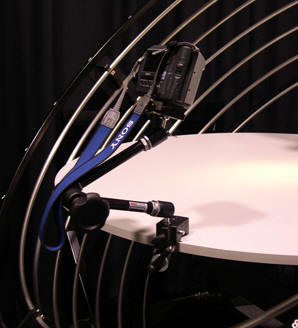 Positioning the camera becomes particularly difficult when using the platform heliodon since the table turns and tilts to adjust the model relative to the sun's position. To assist with this, CERES has provided an adjustable tripod clamp that can be attached to the camera and to the table surface. This allows the camera to move in concert with the table and model. This keeps the camera's framed shot of the model consistent regardless of the table's position. From the camera's point of view, this relationship also helps maintain the perception of the sun moving through the sky rather than the table tilting and swiveling.