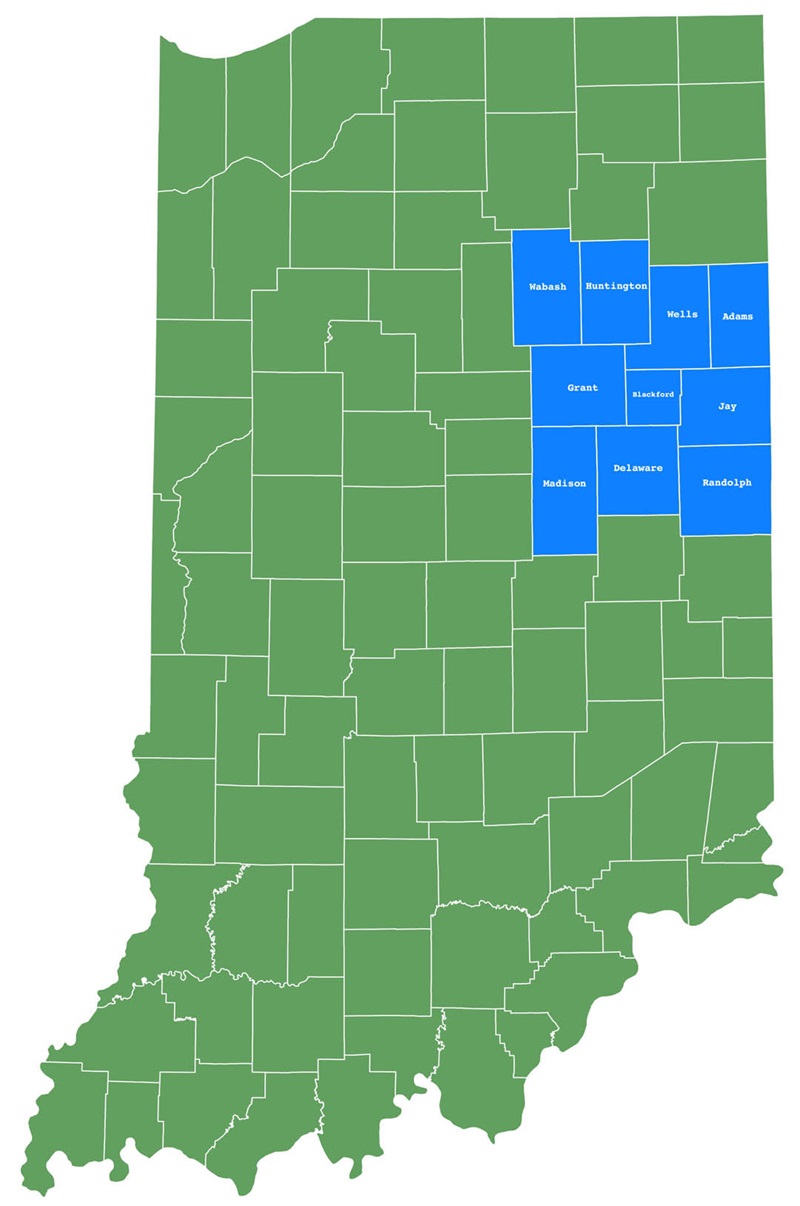The East Central Indiana Area Health Education Center is operated by the Ball State University College of Health and serves a 10-county region including Adams, Blackford, Delaware, Grant, Huntington, Jay, Madison, Randolph, Wabash, and Wells Counties.