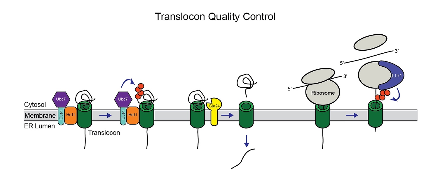 Most eukaryotic proteins that function in the endomembrane system or extracellular space traverse the translocon during or shortly after translation. Proteins that arrest during translocation clog the channel, prevent the passage of other proteins into the endoplasmic reticulum (ER), and impair cell function. Underscoring the importance of maintaining functional translocons, eukaryotes possess multiple conserved translocon quality control (TQC) mechanisms, several of which we have discovered or characterized. Numerous proteins essential for health use the translocon as a portal to the endomembrane system. Enzymes mediating TQC promote neurological homeostasis, healthy aging, and other aspects of human health. At least two proteins with profound significance for metabolic physiology (low-density lipoprotein component apolipoprotein B and oligomeric islet amyloid polypeptide) persistently engage translocons. Components of conserved TQC mechanisms represent potential therapeutic targets for several human diseases, including hypercholesterolemia and diabetes. Our lab uses a combination of genetic and biochemical approaches in a yeast model system to characterize molecular mechanisms by which cells resolved clogged channels.