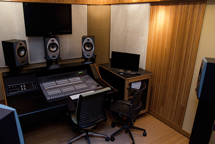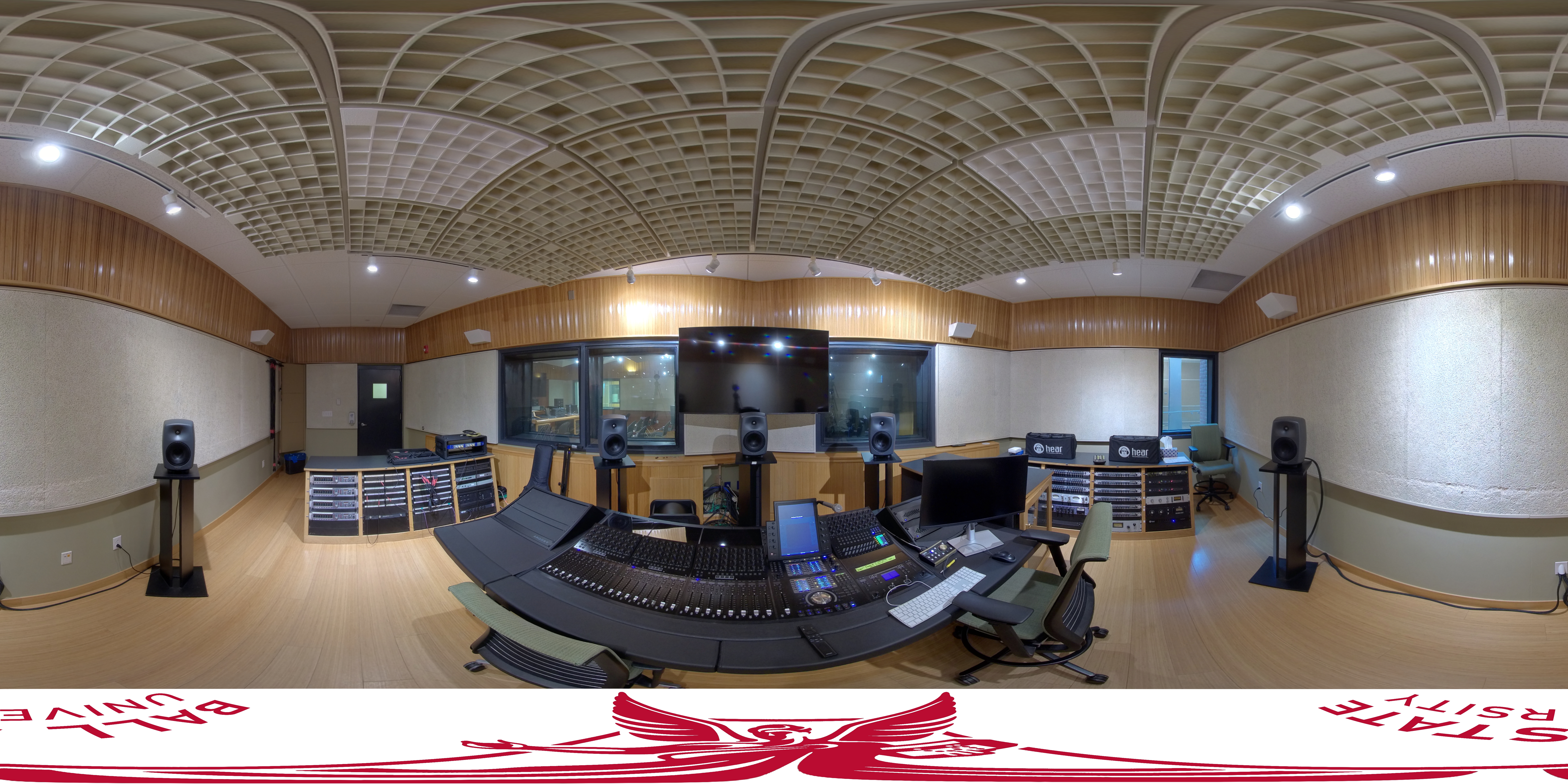 Used by student groups like NewsLink Indiana, Waking Up with Cardinal Weather, and Reel Deal, this state-of-the-art, automated video production studio has live streaming capabilities with live field equipment, energy efficient LED and fluorescent lights to keep the studio cool, and the same weather computer system used by The Weather Channel. For breaking news and live interviews, the audio studio can connect live with all other university media outlets.