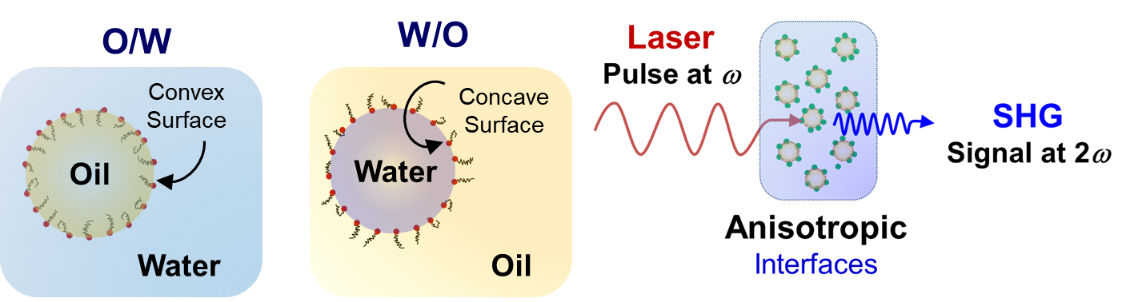 Liquid/liquid interfaces, and in particular, oil/water interfaces play an important role in many areas involving petroleum science, food chemistry, catalysis, and biomedical processes. Our group explores the effect of nanoscale on molecular adsorption at the O/W and W/O interfaces. Additionally, we use probe molecules and laser spectroscopy to “sense” and decipher the spectroscopic properties of this chemically unique region between two bulk phases.