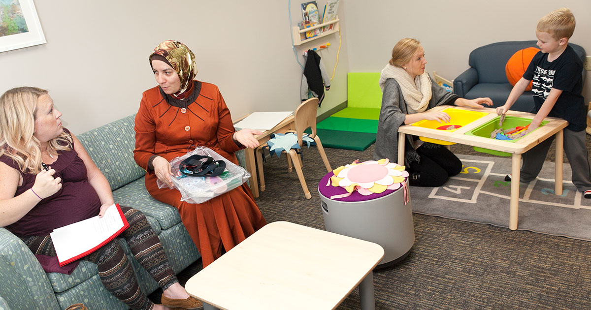 Often parents are the ones playing with their child inside the lab while Kanakri monitors them outside. On the day we observed, senior Leah Mattingly built a sand castle with Camden and played catch while he chattered happily about Michael Jackson videos.