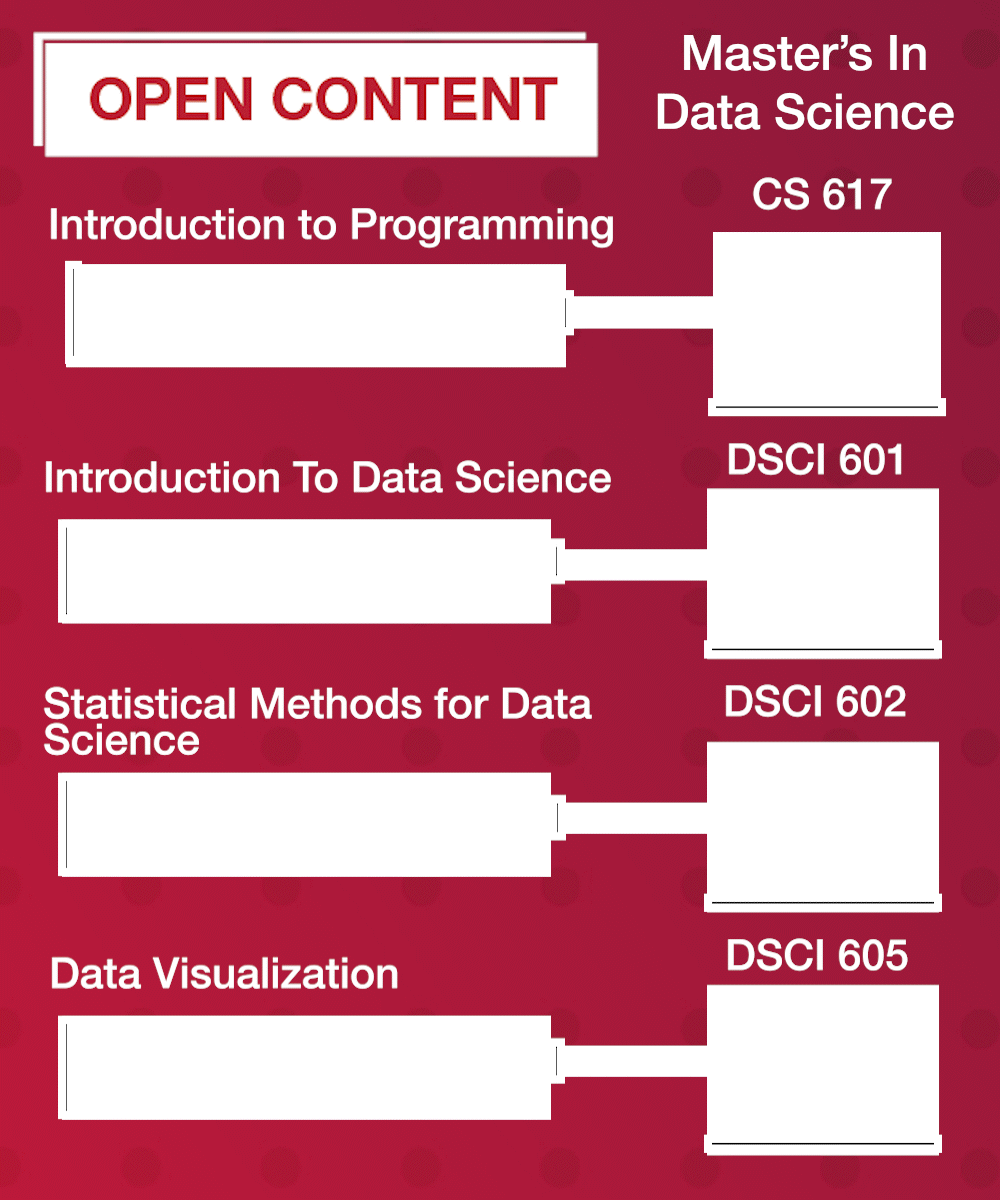 - Get a head start: completed work in open course Introduction to Programming transfers to CS 617. Completed work in open course Data Visualization transfers to DSCI 605. Completed work in open course Introduction to Data Science transfers to DSCI 601. Completed work in open course Statistical Methods for Data Science transfers to DSCI 602. When you enroll in degree courses CS 617, DSCI 601, DSCI 602, or DSCI 605, you don’t have to resubmit projects you’ve already completed in open content courses.