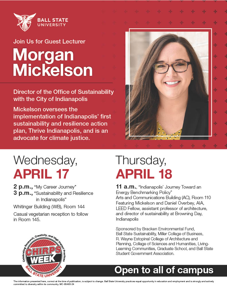 Morgan Mickelson, Director of the Office of Sustainability with the City of Indianapolis, oversees the implementation of Indianapolis’ first sustainability and resilience action plan, Thrive Indianapolis. On April 18th, Mickelson and professor Dan Overbey, AIA, LEED Fellow, assistant director of architecture, and director of sustainability at Browning Day, Indianapolis, will speak about the first environmental-focused policy to come out of the Office of Sustainability in a "Indianapolis' Journey Towards an Energy Benchmarking Policy" at 11am in AC 110.