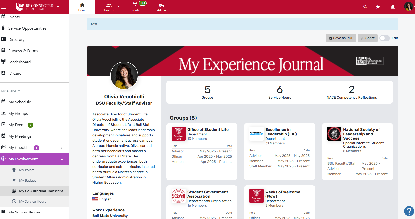The My Experience Journal is your personal journal of your Ball State experience that prepares you for a fulfilling career and meaningful life - a space to memorialize your reflections on everything you’ve done outside the classroom (extra-curricular and co-curricular), in academic courses, and intercollegiate athletics at Ball State University that enabled you to acquire the 8 NACE competencies and explore your purpose.