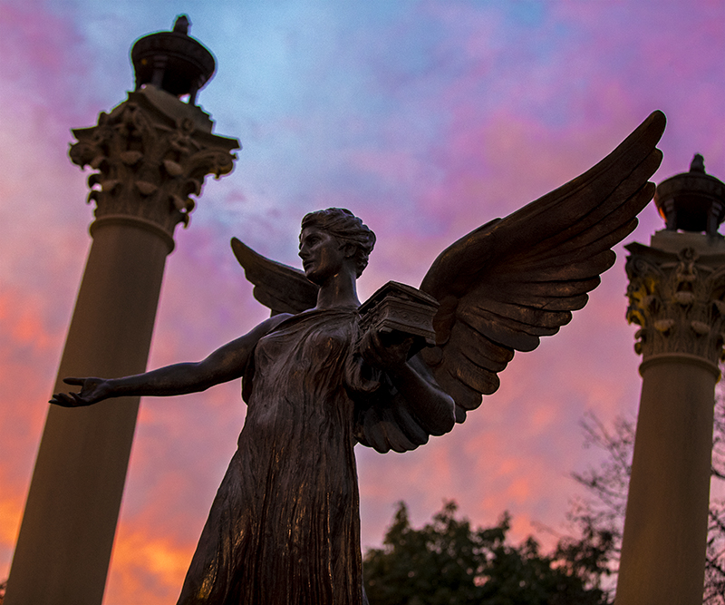 Today, he towers over Riverside Avenue on the south side of the Teachers College Building.