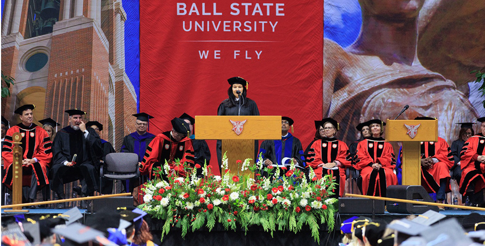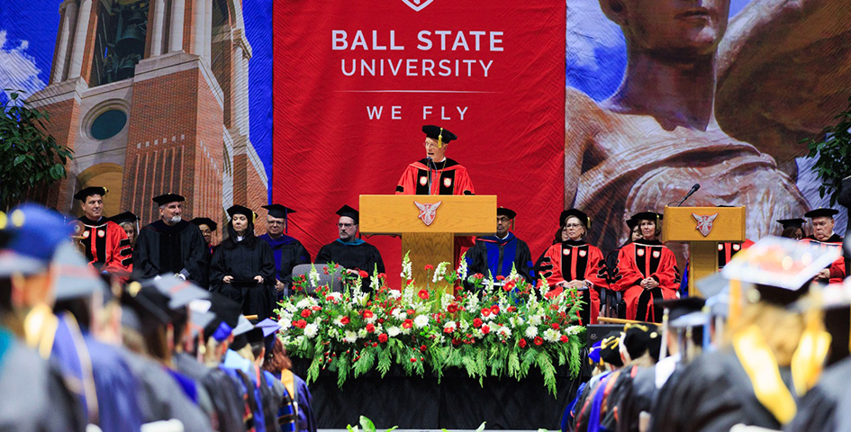 The event featured an inspiring address to the graduating class from Indiana’s First Lady, Janet Holcomb, ’92 MA ’96, a two-time Ball State alumna. Her husband, Gov. Eric Holcomb, was also in attendance on Saturday to receive an honorary Doctor of Laws degree from the University in recognition of his public service and leadership.