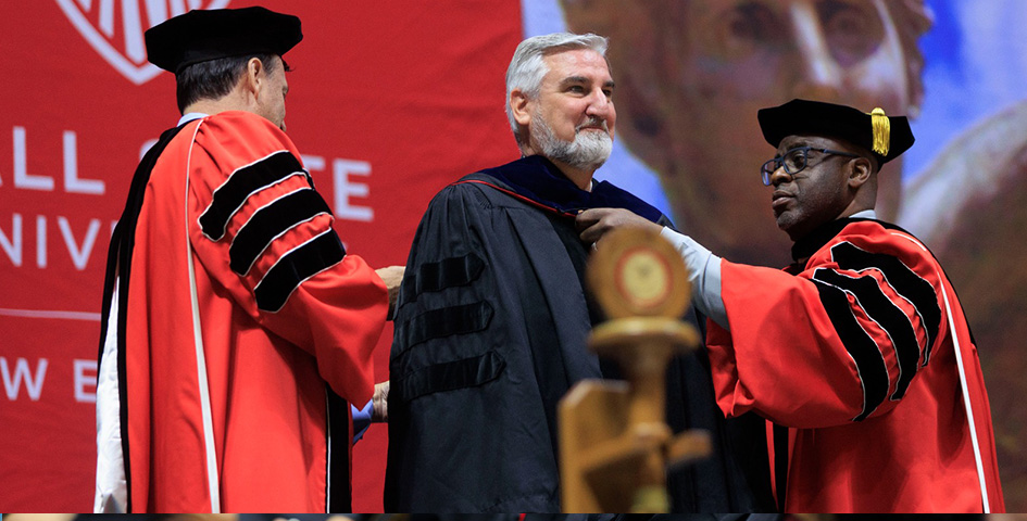 Ball State on Saturday also recognized Gov. Holcomb, who received an honorary Doctor of Laws degree for his exemplary service to the state and his contributions to education and workforce development.