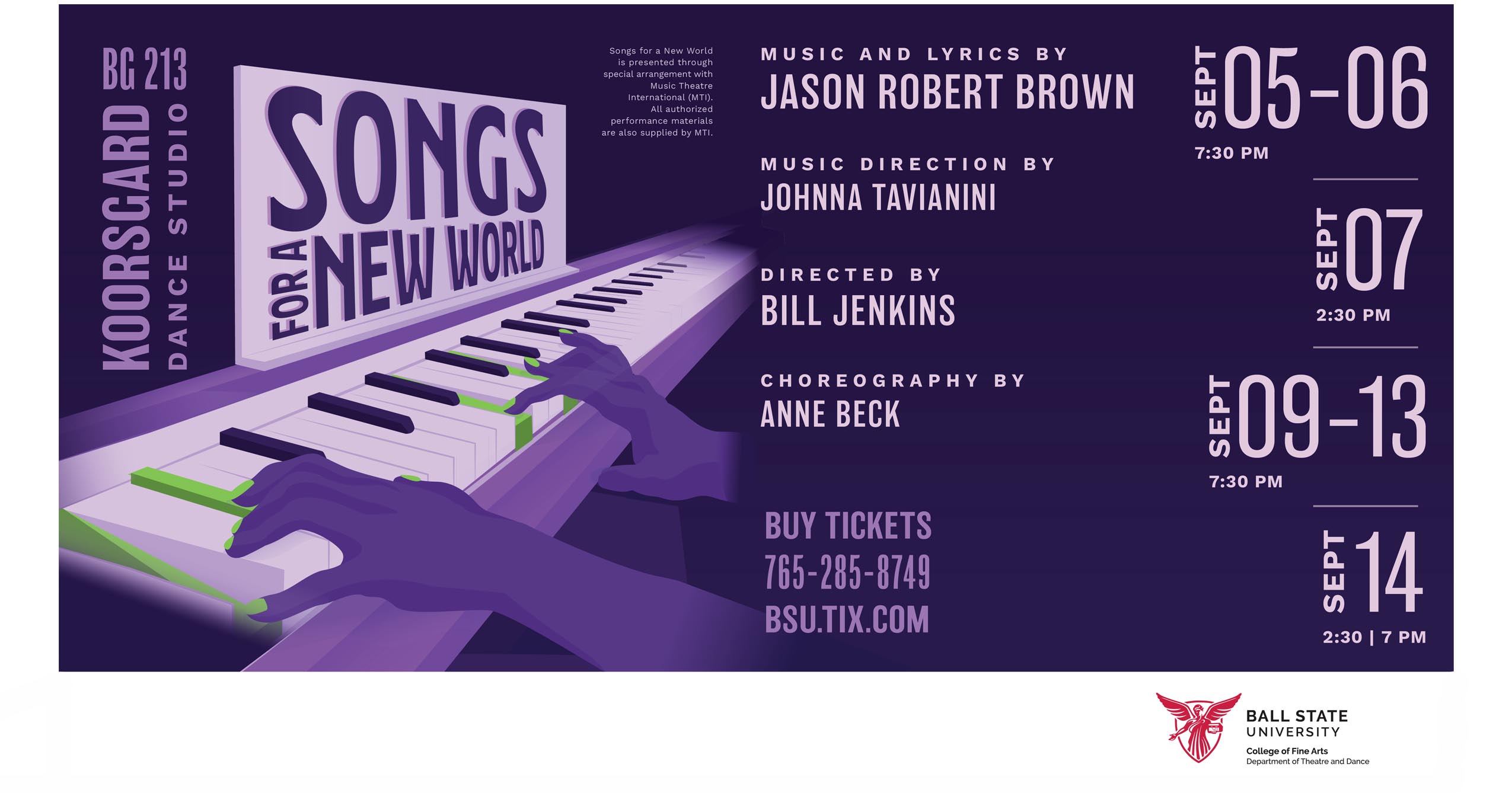 Ball State University’s Department of Theatre and Dance presents Jason Robert Brown’s "Songs for a New World"—a powerful, genre-blending theatrical song cycle—Sept. 5-7 and 9-14, at Korsgaard Dance Studio in Ball Gymnasium.